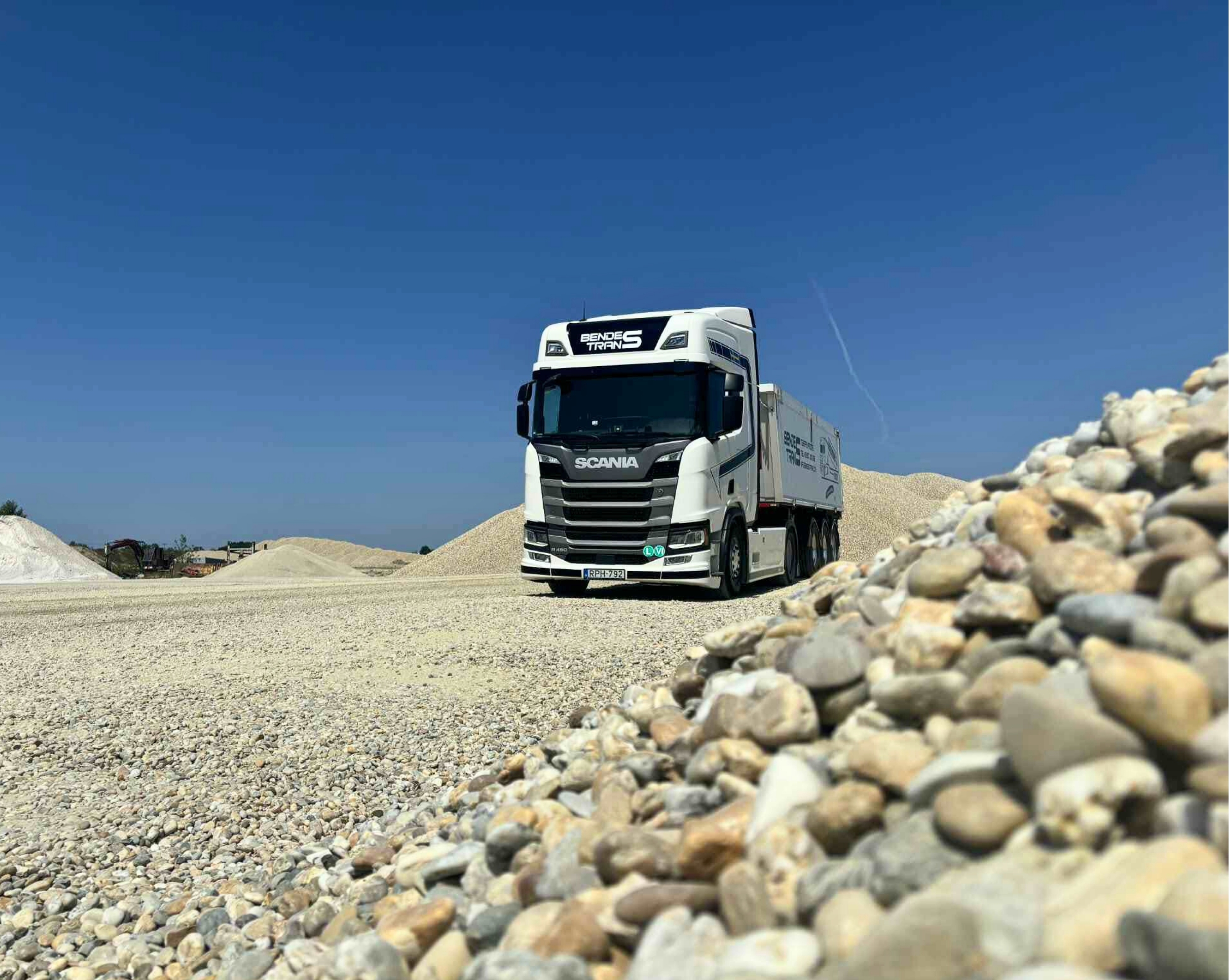 Szállításainkat modern, jól karbantartott 40 tonna össztömegű teherautókkal végezzük, amelyek alkalmasak nagy tömegű, ömlesztett anyagok biztonságos fuvarozására akár nehezebb terepviszonyok között is.